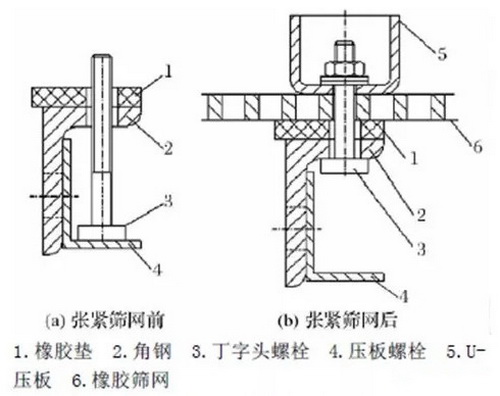 (4)鋪好篩網,預張緊,再安裝上壓板;壓板壓緊后再將篩網張緊到設計要求。